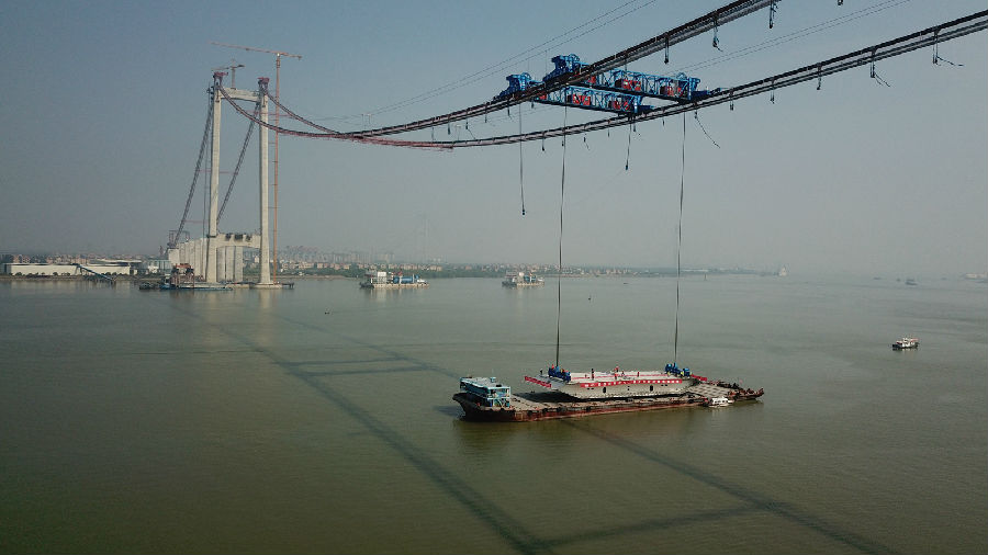 虎(hu)門(men)二橋鋼(gang)箱(xiang)梁全寬(kuan)49.7米,是(shi)(shi)目前世界(jie)上(shang)最寬(kuan)的整體式懸(xuan)索橋鋼(gang)箱(xiang)梁,此(ci)次大(da)(da)沙水道(dao)橋首片鋼(gang)箱(xiang)梁的成功架設,創下了世界(jie)最寬(kuan)懸(xuan)索橋鋼(gang)箱(xiang)梁的吊裝紀錄(lu)。據施工人員介紹,本次吊裝由中(zhong)國(guo)交建二公局自(zi)主(zhu)研發的600噸全液(ye)壓跨纜吊機進(jin)行(xing)吊裝,該吊機可以吊裝600噸以下的重物,這(zhe)也是(shi)(shi)目前國(guo)內(nei)最大(da)(da)的懸(xuan)索橋跨纜吊機。