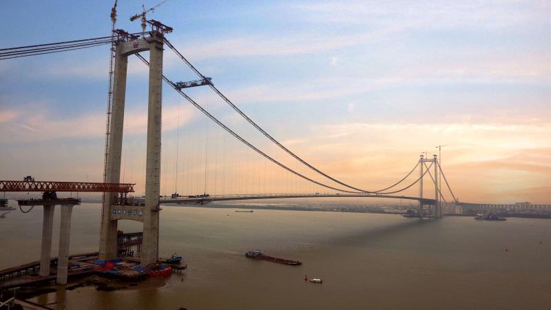 1月9日,隨(sui)著最后一(yi)片鋼(gang)(gang)箱(xiang)梁的(de)吊裝(zhuang)完(wan)畢,世(shi)界(jie)上最寬的(de)鋼(gang)(gang)箱(xiang)梁懸(xuan)索橋(qiao)——虎門二(er)橋(qiao)大沙(sha)水道(dao)橋(qiao)成功合龍。