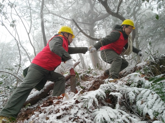 安徽績溪供電公司員工抬著變壓器在雪地里艱難前行
