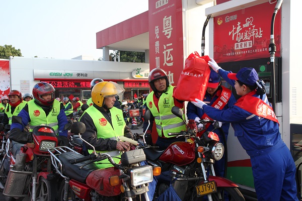 2月1日起至2月7日,中(zhong)國石(shi)(shi)化在廣(guang)(guang)東(dong)繼(ji)續(xu)為(wei)1萬(wan)名“返鄉(xiang)摩騎”免(mian)費加油,并贈(zeng)送太平意外(wai)保險和保暖衣(yi)物(wu)、食品等愛心(xin)物(wu)資。同(tong)時,攜手廣(guang)(guang)東(dong)郵政(zheng)EMS為(wei)“返鄉(xiang)摩騎”免(mian)費寄送1萬(wan)份行(xing)李,繼(ji)續(xu)與(yu)粵運交(jiao)通合作開通15臺免(mian)費愛心(xin)大巴。春運期間(jian),廣(guang)(guang)東(dong)、廣(guang)(guang)西238座中(zhong)國石(shi)(shi)化加油站(zhan)將(jiang)變身“情暖驛站(zhan)”,與(yu)廣(guang)(guang)東(dong)團省委共(gong)同(tong)組織5000多名志愿(yuan)者,為(wei)數百萬(wan)春運返鄉(xiang)車主提供(gong)“1+10+X”免(mian)費服務。