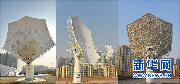 這是SKA——平方公里陣列射電望遠鏡首臺天線樣機的正面(左)、側面(中)和背面(2月6日攝,拼版照片)