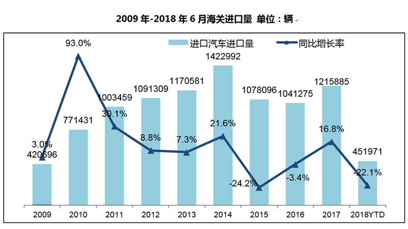 從供給方面看(kan),2018年(nian)(nian)上(shang)半年(nian)(nian),海關進口量大幅下(xia)滑。2018年(nian)(nian)1-6月累計進口汽車45.2萬輛,同比下(xia)降22.1%,增速(su)相比2017年(nian)(nian)全(quan)年(nian)(nian)的16.8%回落38.9個百分(fen)點(dian)。