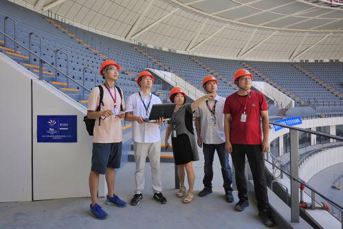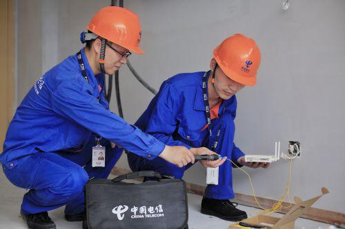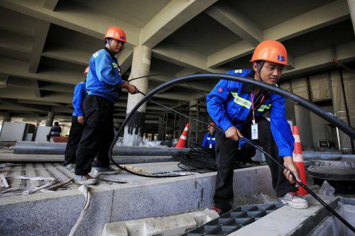 中國電信(xin)施(shi)工人員在布放場館內WiFi設(she)備(bei)接入(ru)線路