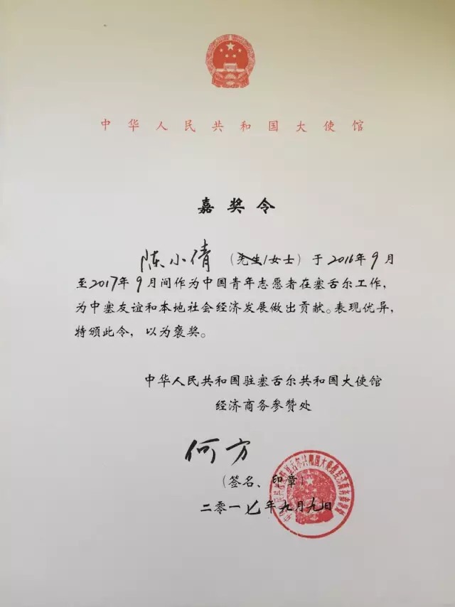 中(zhong)華人民(min)共和(he)國駐(zhu)塞舌爾共和(he)國大使(shi)館(guan)為陳小倩(qian)頒(ban)發的嘉獎令