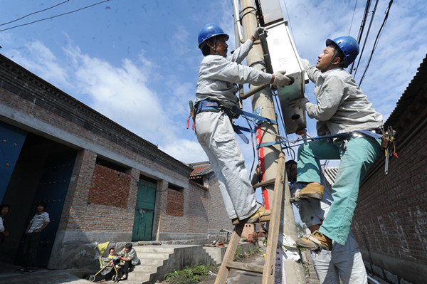 北京昌平供電(dian)公司(si)員(yuan)工在十三(san)陵鎮(zhen)康陵村進(jin)行(xing)“煤改電(dian)”施工