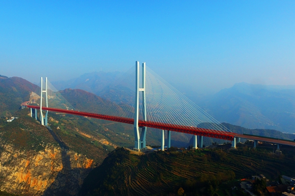 北(bei)盤江第(di)一(yi)橋(qiao)(qiao)位(wei)于云南省(sheng)和貴州(zhou)省(sheng)交界處,跨(kua)越北(bei)盤江大峽谷(gu),是(shi)杭瑞高速畢節至都格(ge)段的(de)重(zhong)點控制性(xing)工程。大橋(qiao)(qiao)全長1341.4米,主橋(qiao)(qiao)為(wei)跨(kua)徑(jing)720 米的(de)鋼桁梁斜拉橋(qiao)(qiao),在同類型橋(qiao)(qiao)梁中位(wei)居世界第(di)二。該(gai)(gai)橋(qiao)(qiao)橋(qiao)(qiao)面(mian)至谷(gu)底高差達565.4米,相當于200層(ceng)樓高,是(shi)目前“世界第(di)一(yi)高橋(qiao)(qiao)”。中國交建(jian)二航(hang)局負責大橋(qiao)(qiao)貴州(zhou)岸施(shi)工,該(gai)(gai)項目于2012年開(kai)工建(jian)設(she),2016年12月29日建(jian)成通車。