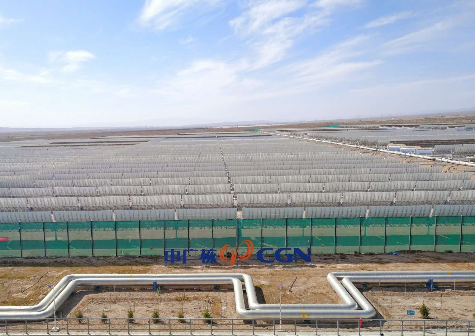 中廣核德令(ling)哈(ha)光熱(re)(re)示范項(xiang)目位于青海(hai)省海(hai)西蒙古族(zu)藏族(zu)自治(zhi)州德令(ling)哈(ha)市(shi)的(de)戈(ge)壁灘上,占地(di)2.46平方(fang)公里(li),相當于360多個標準足球場的(de)面積(ji),采用了槽式(shi)導熱(re)(re)油集熱(re)(re)技(ji)術路線,配(pei)套(tao)9小時熔融鹽儲熱(re)(re),由太(tai)陽島、熱(re)(re)傳及蒸汽發生系統(tong)、儲熱(re)(re)島、發電島四大部分(fen)組成(cheng)。