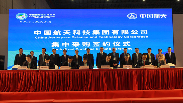 11月6日,首屆中國國際進口博覽會期間,中國航天科技集團有限公司舉行集中采購簽約儀式,集團公司所屬10家企業與來自全球9個國家以及中國香港、中國臺灣地區的13家企業集中簽署了16個項目的采購合同或協議,全面推動中國航天與全球產業鏈的互動與合作。16個簽約項目(mu)涵蓋航(hang)空(kong)物流(liu)、新(xin)材料、先(xian)進傳感(gan)、新(xin)能源、特種裝(zhuang)備等(deng)多個領域,簽約合作方為(wei)俄(e)羅斯(si)、美(mei)國(guo)、法國(guo)、意大利、韓國(guo)、阿(a)聯(lian)酋、日本、德國(guo)、瑞士(shi)等(deng)國(guo)企業(ye)以(yi)及中國(guo)香港、中國(guo)臺(tai)灣地區(qu)企業(ye)。