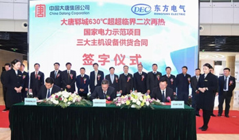 2018年11月23日(ri),東方(fang)電(dian)(dian)氣集團簽署大唐(tang)鄆城630℃超超臨界(jie)二次再熱(re)國家電(dian)(dian)力示范項目合同