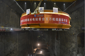 2018年11月24日,東方電氣白鶴(he)灘(tan)百萬機組(zu)精品座環在工地(di)吊裝到位