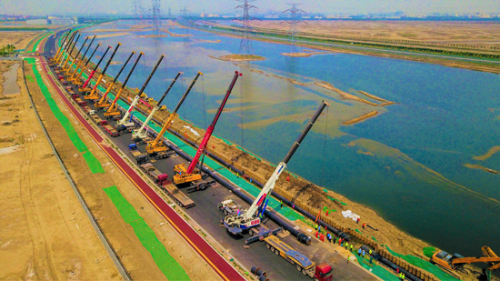 該項目(mu)面臨(lin)地下水位偏高(gao)、管(guan)(guan)道下穿高(gao)速(su)公路高(gao)架橋及人(ren)工(gong)(gong)河道,施(shi)(shi)工(gong)(gong)段(duan)(duan)孤石遍布等困難。項目(mu)團隊反復研(yan)討(tao)、細致(zhi)測(ce)算、模(mo)擬實(shi)驗,通過(guo)優化(hua)方案(an),創新運用沉箱(xiang)工(gong)(gong)作(zuo)井、整體焊接吊裝、大(da)直徑頂管(guan)(guan)等施(shi)(shi)工(gong)(gong)工(gong)(gong)藝,突破了施(shi)(shi)工(gong)(gong)瓶(ping)頸。特別是通過(guo)16臺100噸到500噸不等噸位的起重(zhong)機(ji)整齊劃一地排(pai)成一排(pai),在(zai)技術人(ren)員的有序調度(du)、駕(jia)駛員的靈(ling)活操作(zuo)下,吊車準確無誤地將焊接完畢的總長近1600米、重(zhong)達800噸的四段(duan)(duan)管(guan)(guan)線吊裝至既定(ding)基坑(keng),確保了管(guan)(guan)線主干線在(zai)既定(ding)工(gong)(gong)期內實(shi)現(xian)貫通。