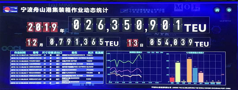 12月13日8時(shi)30分(fen),隨著寧(ning)波舟山港調度指(zhi)揮中心大屏幕(mu)上的(de)集(ji)裝箱實時(shi)生產數據跳過“26350901”標準箱,寧(ning)波舟山港今年集(ji)裝箱吞吐量已超去年總(zong)量。