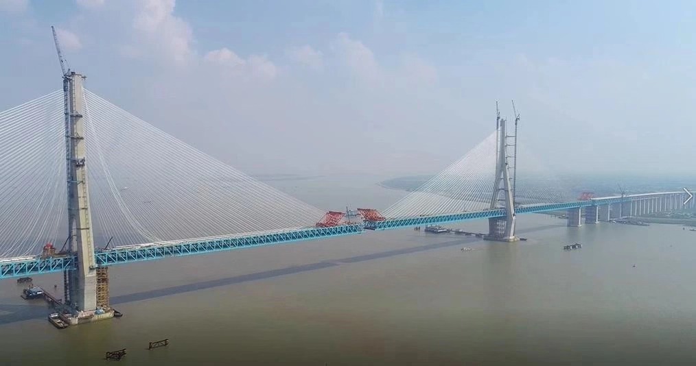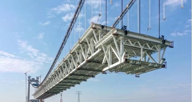 五峰山長江大(da)橋(qiao)自2015年10月開(kai)工(gong)建設,以江蘇省鐵(tie)(tie)路(lu)集團(tuan)為(wei)主(zhu)投資,由國鐵(tie)(tie)上海局集團(tuan)建設管(guan)理、中鐵(tie)(tie)大(da)橋(qiao)院(yuan)設計(ji)、鐵(tie)(tie)科院(yuan)大(da)橋(qiao)院(yuan)聯合(he)體監理、中鐵(tie)(tie)大(da)橋(qiao)局施(shi)工(gong),全長6409米,主(zhu)跨(kua)(kua)1092米,上層(ceng)為(wei)雙(shuang)向八車道高速(su)公路(lu),設計(ji)時(shi)速(su)為(wei)100公里。下層(ceng)為(wei)四線高速(su)鐵(tie)(tie)路(lu),設計(ji)時(shi)速(su)為(wei)250公里。該橋(qiao)是我國首(shou)座公鐵(tie)(tie)兩用(yong)懸索(suo)橋(qiao),也是世界上運行(xing)速(su)度最(zui)(zui)快、運行(xing)荷載(zai)最(zui)(zui)大(da)、跨(kua)(kua)度最(zui)(zui)大(da)的公鐵(tie)(tie)兩用(yong)懸索(suo)橋(qiao),是我國建橋(qiao)史上又一座豐碑。