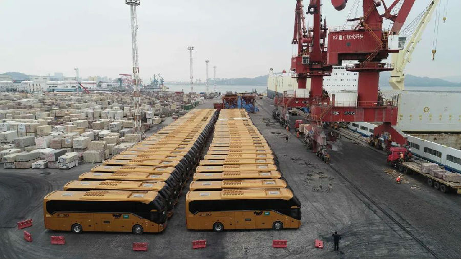 繼213輛豪(hao)華大巴(ba)出(chu)(chu)口沙(sha)特后,近日,363輛金(jin)龍客(ke)車(che)大巴(ba)再次(ci)從廈門現代碼頭揚帆(fan)啟航,其中(zhong)297輛前往沙(sha)特,66輛奔赴萬里之遙(yao)的(de)智利。面對疫(yi)情大考,金(jin)龍客(ke)車(che)在做(zuo)好防疫(yi)工作(zuo)的(de)同(tong)時,全力以(yi)赴滿負荷推進生產(chan),讓中(zhong)國制造的(de)蓬(peng)勃力量持續向(xiang)海外輸(shu)出(chu)(chu)。