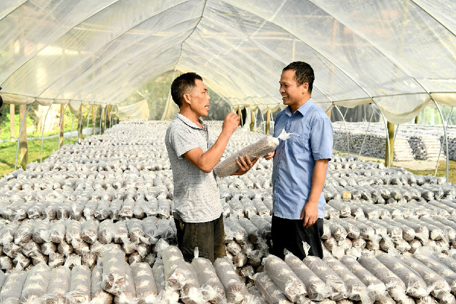 楓木村菌場內,村民與柳工扶貧人員分享菌場良好發展勢頭的喜悅