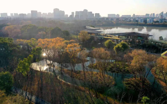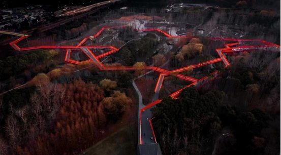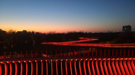 空中廊橋,是西南湖景觀提升中的最大亮點,全長2462米,距離地面最高處12米,以紅色為主色調,造型靈動,成為南湖中最亮眼的紅。夜色下,遠遠望去,廊橋宛如一條即將騰飛的紅色巨龍。