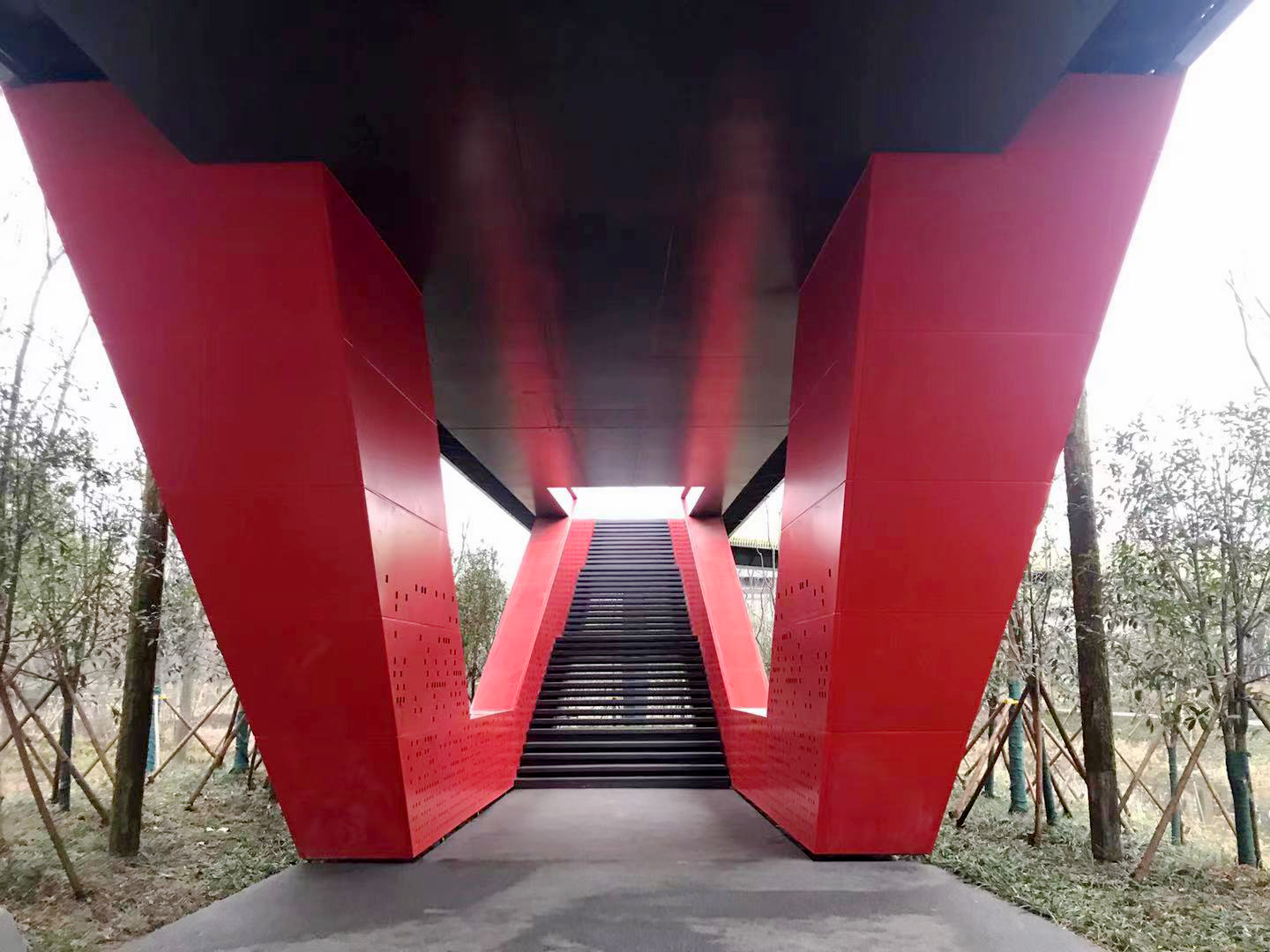 廊橋紅旗一角異形結構墩柱、鋁板效果