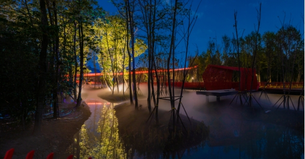 林間觀景亭,是空中廊橋親水段的主要標志,其主體以鋼結構為主。對異型不銹鋼構件拼裝成“蜂巢形”,達到不同角度有不同的視覺體驗。同時,面向水上森林,與廊橋相連,白天主要作為休閑活動場所,可以在此休憩,閱讀,露營等。夜晚,其景觀噴霧與燈光的交相輝映,可以給人們帶來非常震撼、愉悅的感官體驗。