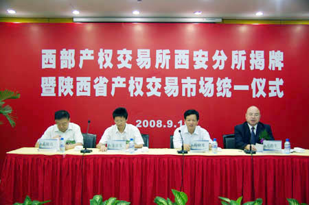 9月19日上午9時,由陜西省國資委主辦的“西部產權交易所西安分所揭牌暨陜西省產權交易市場統一儀式”在西安隆重舉行。省國資委副主任楊曉連和西安市國資委副主任王立安為西部產權交易所西安分所揭牌,楊曉連副主任受省政府領導委托莊嚴宣布陜西省全省產權交易市場正式統一。省國資委、財政廳、發改委、監察廳、工商局、證監局、金融辦、科技廳、知識產權局和西安市國資委等有關部門及省市產權交易機構代表100多人參加了儀式。