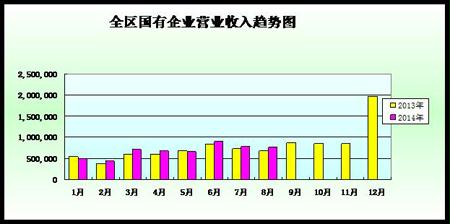 2014年(nian)1-8月(yue),新疆國有企(qi)業(ye)累計實現(xian)營業(ye)收(shou)入541.94億(yi)(yi)元(yuan),同比(bi)增(zeng)(zeng)加66.40億(yi)(yi)元(yuan),增(zeng)(zeng)長14.0%;成本費用總(zong)額555.82億(yi)(yi)元(yuan),同比(bi)增(zeng)(zeng)加84.58億(yi)(yi)元(yuan),增(zeng)(zeng)長17.8%;實現(xian)利潤總(zong)額26.12億(yi)(yi)元(yuan),同比(bi)減少9.36億(yi)(yi)元(yuan),下降26.4%;上交(jiao)稅費32.69億(yi)(yi)元(yuan),同比(bi)增(zeng)(zeng)加3.15億(yi)(yi)元(yuan),增(zeng)(zeng)長10.6%。