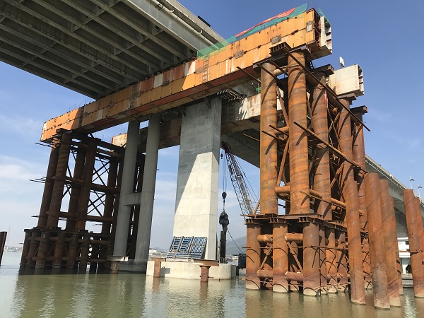 為盡早修復(fu)(fu)磨(mo)刀門(men)大(da)(da)橋(qiao),方便廣大(da)(da)群眾出行,廣東省交(jiao)通集團隨即組(zu)織了(le)經驗豐富的(de)檢測、設(she)計、施(shi)(shi)工、監理隊伍,在確保安全和質量的(de)前(qian)提下(xia)全力開展大(da)(da)橋(qiao)應急(ji)搶險工程施(shi)(shi)工。大(da)(da)橋(qiao)修復(fu)(fu)方案采(cai)用48根臨(lin)時墩鋼管支(zhi)承樁基礎(chu)及4條鋼箱(xiang)托梁(單條托梁長度49米,重(zhong)達196噸)對受損(sun)橋(qiao)梁上部結構進(jin)行臨(lin)時穩(wen)定加固,對受損(sun)下(xia)部結構進(jin)行切割拆除,最(zui)后在原位(wei)置(zhi)進(jin)行橋(qiao)墩樁基礎(chu)和下(xia)部結構重(zhong)建(jian)施(shi)(shi)工,梁體(ti)復(fu)(fu)位(wei)。