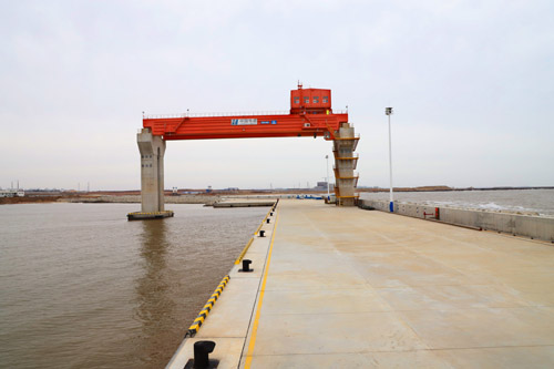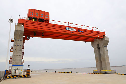 太重(zhong)設計制造的跨度最大的固(gu)定(ding)橋式起(qi)重(zhong)機如巨人般聳(song)立(li)在華能(neng)山東石島灣高(gao)溫氣(qi)冷堆核(he)電廠碼頭(tou),為其大件設備運輸提供碼頭(tou)裝卸船作業。