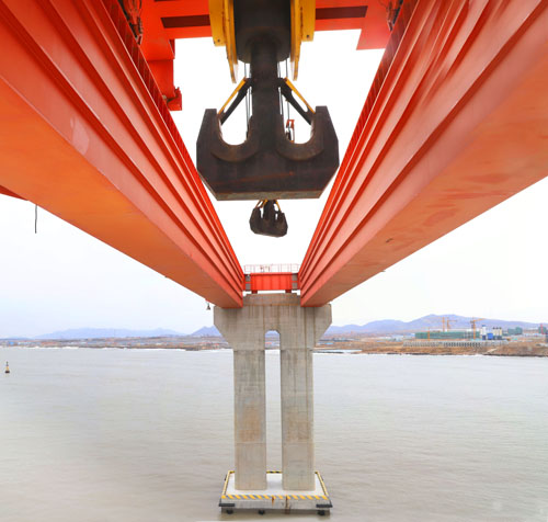 該設備主要(yao)是通(tong)過將橋(qiao)架固定于活動(dong)的(de)盆式(shi)橡膠(jiao)支(zhi)座,安裝在水(shui)工墩臺基礎上的(de)橋(qiao)式(shi)起重機(ji),小(xiao)車在鋼結構橋(qiao)架上自(zi)行行走,通(tong)過小(xiao)車的(de)提升(sheng)裝置(zhi)實現重物的(de)卸船(chuan)作業。