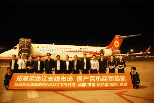5月2日,成(cheng)都航空公司采(cai)用(yong)我國具有自(zi)主知識產權的(de)支線(xian)客(ke)機(ji)ARJ21飛(fei)機(ji)首次執(zhi)飛(fei)成(cheng)都-濟南-哈爾濱航線(xian),這標(biao)志(zhi)著ARJ21飛(fei)機(ji)正(zheng)式在我國最北部(bu)的(de)黑龍(long)江省實行載客(ke)運營。