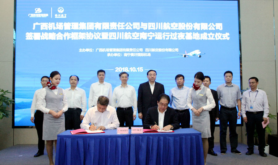 10月15日,四(si)川(chuan)航(hang)(hang)空股份有(you)限公司(以下簡(jian)稱(cheng)川(chuan)航(hang)(hang))與廣西(xi)機(ji)場(chang)管(guan)理集(ji)團(tuan)有(you)限責任公司(以下簡(jian)稱(cheng)廣西(xi)機(ji)場(chang)管(guan)理集(ji)團(tuan))簽署(shu)戰略(lve)合(he)作框架協(xie)議,同(tong)日川(chuan)航(hang)(hang)南(nan)寧(ning)運行(xing)過夜基(ji)(ji)地正(zheng)式掛牌運行(xing)。川(chuan)航(hang)(hang)南(nan)寧(ning)運行(xing)基(ji)(ji)地正(zheng)式成立,南(nan)寧(ning)吳(wu)圩(wei)國際(ji)機(ji)場(chang)駐場(chang)航(hang)(hang)空公司基(ji)(ji)地達到了5家,川(chuan)航(hang)(hang)在成都總部(bu)以外(wai)的分公司及(ji)基(ji)(ji)地數量(liang)達到了11個。