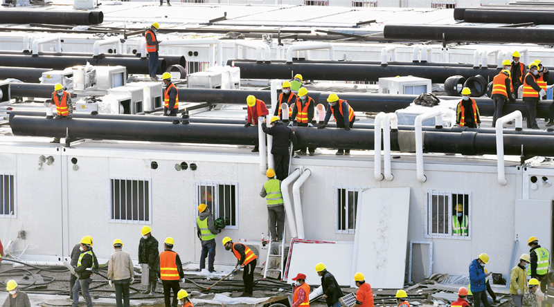 奮斗在黨和人民最需要的地方,是國有企業的光榮傳統,是國企人的血脈靈魂。建設武漢火神山、雷神山專門醫院是黨和人民的重托,國有企業主動請纓、盡銳出戰,打一場過硬的攻堅戰。中國建筑所屬中建三局承建雷神山醫院,經過10晝夜的奮戰,醫院通過驗收,并于2020年2月6日正式移交使用。圖為2月5日,武漢雷神山醫院施工現場。 中新社記者 安源/攝