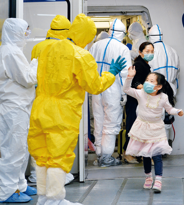 石油石化、電力、通信、糧油、航空運輸等基礎保障型央企把做好保供工作作為首業首責,強化擔當意識、周密組織生產、全力保障供應,優先保障重點地區需要,合力筑起抗擊疫情的堅強后盾。圖為2020年2月5日晚,乘坐東方航空公司包機從新加坡回武漢的一名剛下飛機的小姑娘跟地服人員打招呼。當晚,從日本大阪和新加坡飛來的國航和東航的兩架民航飛機在武漢天河國際機場降落,370名湖北人終于回家。 湖北日報全媒記者 魏錸/攝
