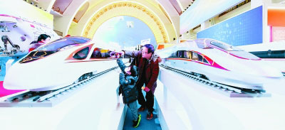 觀眾在“砥礪奮進的五年”大型成就展上參觀“復興號”列車模型。 新華社發
