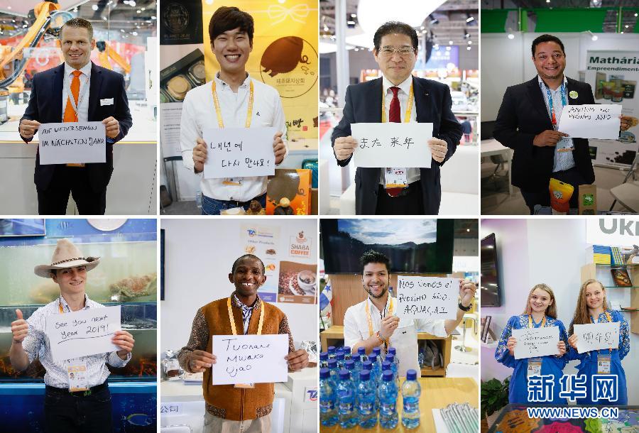 11月10日,進博會上不同國家的參展人員展示用不同語言書寫的“明年見”(拼版照片)。 首屆中國國際進口博覽會11月5日至10日在上海舉行。記者在采訪中了解到,很多參展商在進博會上收獲了不少訂單,宣傳了自己的產品,結識了很多朋友。他們表示,希望明年再來進博會。 (新華社記者 侯東濤 攝)