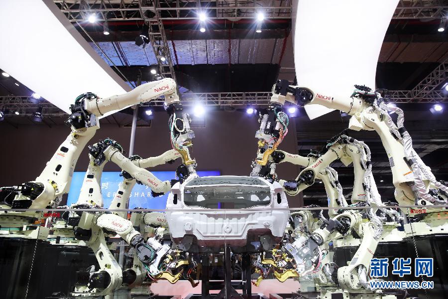 11月6日,日本那智不二越公司展出的點焊密集協作機器人在進行作業演示。 11月5日至10日,首屆中國國際進口博覽會在上海國家會展中心舉行。 (新華社記者 丁汀 攝)