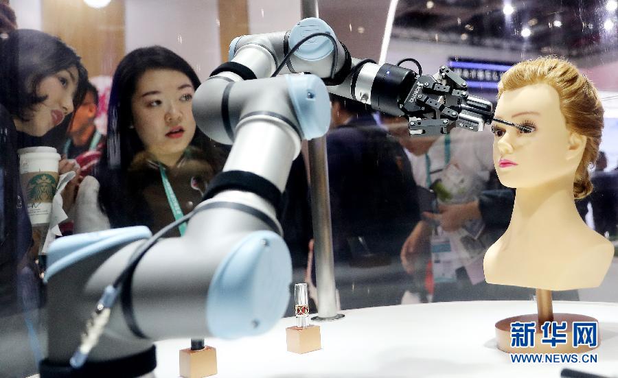 11月7日,參觀者在法國歐萊雅展臺觀看機器人作業演示。 休戚與共的地球村,共享創新成果已成為國際社會的共同意愿和現實選擇。透過進博會這個窗口可以看出,從上下游產業銜接到前沿領域合作,從協作共享資源到開放共享智慧,全球經濟發展的新動能正在匯聚。 (新華社記者 方喆 攝)