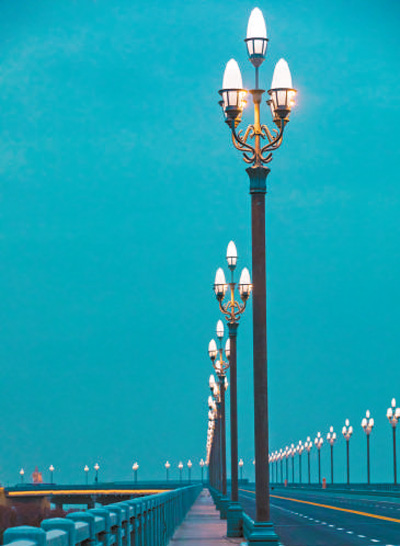 定制LED光(guang)源,照明(ming)強(qiang)度提高10倍(bei),整(zheng)體能耗節(jie)約80%;花中(zhong)主(zhu)燈、輔燈可任意組合開(kai)關燈,根據交(jiao)通流量關閉(bi)主(zhu)燈,又能降低20%電能消(xiao)耗;見光(guang)不(bu)見燈,三(san)面紅旗在光(guang)影藝術下動感飄(piao)揚,橋頭堡上卻(que)不(bu)打(da)一顆釘。