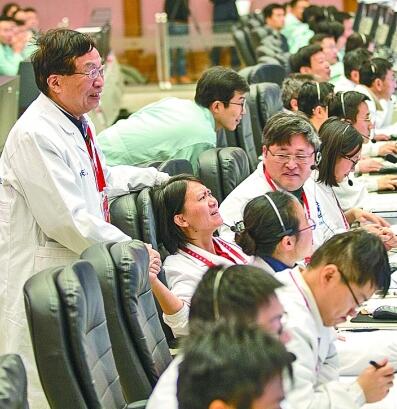 嫦娥四號落月的一刻,現場工作人員因激動而握住了手。新華社發