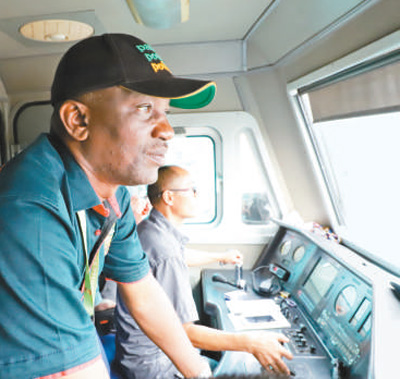 拉各斯的列車駕駛員阿馬奧·奧蘭萊瓦居正在認真駕駛新列車。(記者 姜宣攝)