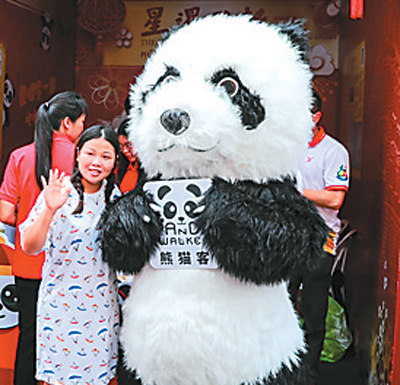 中國游客在泰國曼谷唐人街與熊貓人偶合影。新華社記者 張可任攝