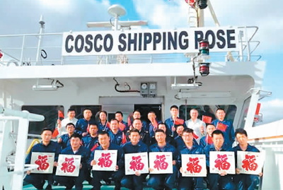 中國工作人員在“中遠海運玫瑰”輪上過春節。受訪者供圖