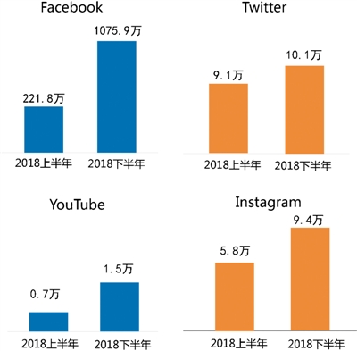 2018年(nian)以(yi)來,尤其是6月份以(yi)后,央(yang)(yang)企(qi)(qi)及其子公(gong)司新(xin)開通(tong)了幾(ji)十(shi)個(ge)境外社交媒體賬(zhang)(zhang)號。受(shou)此(ci)影響,與2018年(nian)上半年(nian)相(xiang)比,Facebook平(ping)臺(tai)(tai)(tai)中央(yang)(yang)企(qi)(qi)業(ye)集(ji)(ji)團賬(zhang)(zhang)號的總(zong)粉(fen)絲(si)(si)量增(zeng)(zeng)長(chang)(chang)最迅猛,增(zeng)(zeng)長(chang)(chang)率(lv)(lv)高(gao)達385.2%,增(zeng)(zeng)長(chang)(chang)量為(wei)850余萬(wan)。其次,YouTube平(ping)臺(tai)(tai)(tai)央(yang)(yang)企(qi)(qi)集(ji)(ji)團賬(zhang)(zhang)號的總(zong)粉(fen)絲(si)(si)量增(zeng)(zeng)長(chang)(chang)率(lv)(lv)也非常(chang)可觀,為(wei)101.2%,增(zeng)(zeng)長(chang)(chang)量為(wei)7523個(ge);與上半年(nian)相(xiang)比,Instagram平(ping)臺(tai)(tai)(tai)央(yang)(yang)企(qi)(qi)集(ji)(ji)團賬(zhang)(zhang)號的粉(fen)絲(si)(si)量增(zeng)(zeng)長(chang)(chang)62.0%,增(zeng)(zeng)長(chang)(chang)了3.6余萬(wan);Twitter平(ping)臺(tai)(tai)(tai)央(yang)(yang)企(qi)(qi)集(ji)(ji)團賬(zhang)(zhang)號總(zong)粉(fen)絲(si)(si)量增(zeng)(zeng)長(chang)(chang)率(lv)(lv)為(wei)10.7%,粉(fen)絲(si)(si)量比上半年(nian)增(zeng)(zeng)長(chang)(chang)近萬(wan)個(ge)。(見圖(tu)4)
