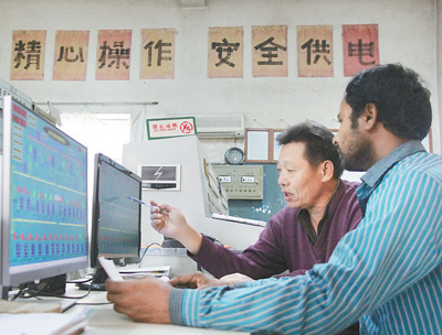 在煤礦配電室內,中方技術人員正在對孟加拉國員工進行指導。記者 苑基榮攝