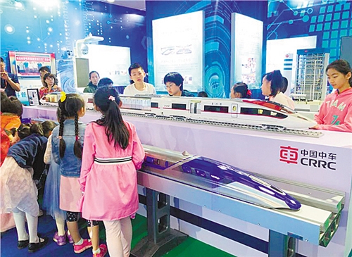 圖② 參觀者在科技活動周主場館了解由中國中車集團帶來的高速磁懸浮列車模型。(郭靜原攝)