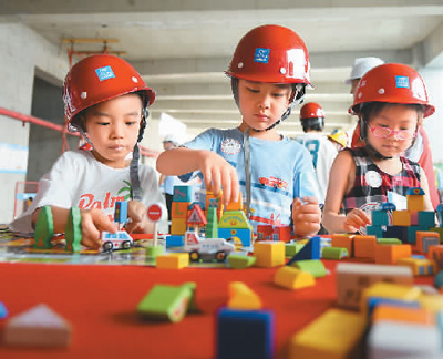 第四屆“首都國企開放日”活動日前在北京舉行,眾多市民走進數十家企業進行參觀體驗。圖為在中建二局三公司位于北京豐臺區的一處項目工地,小朋友體驗“建房子”游戲。(任鵬飛 攝 )
