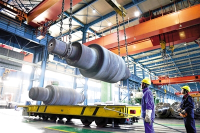 在中國一重集團的生產車間,起重機吊起產品。(記者 王建威 攝)