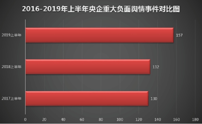 重大事件方面,2019年上半年中央企業重大負面輿情事件157件,與去年同期相比增長18.9%。其中,貪腐類輿情數量明顯增多。但由于整體社會輿情熱點的分散效應,國企負面事件的破壞力影響力相對有限。