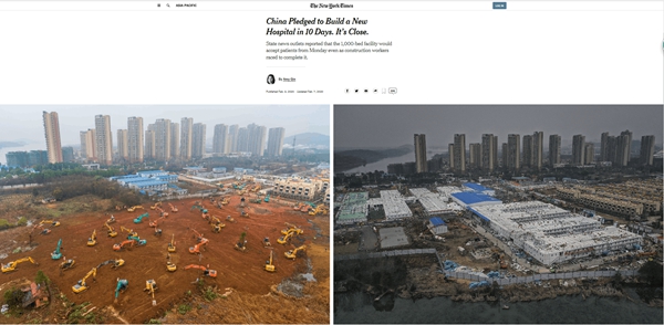 國際主流媒體高度關注中國企業“超(chao)高速”建(jian)設應急醫(yi)院(yuan),已相(xiang)繼交付使用的武漢(han)火神山(shan)和雷神山(shan)兩所“小湯山(shan)模式”醫(yi)院(yuan)成為報道(dao)熱點。