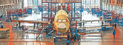 3月6日,工人在中國商飛上海飛機制(zhi)造(zao)有限公(gong)司的生產車間內作業(ye)。新華社記者 丁汀攝(she)