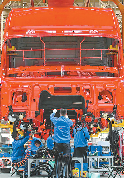 4月23日,工(gong)(gong)人在陜西汽車控股集團有限(xian)公(gong)司(si)重卡總裝線工(gong)(gong)作(zuo)。新(xin)華(hua)社記者 張(zhang)博文攝