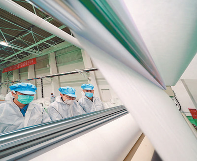 4月23日,燕山石化(hua)工人正在(zai)熔噴無紡(fang)布生產線(xian)上(shang)工作,該生產線(xian)僅用(yong)時(shi)12天就建成投(tou)產。人民日報記者(zhe) 賀 勇(yong)攝